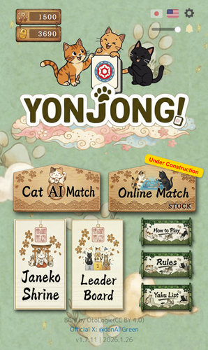 Welcome to the world of "Yonjang!", where cute cats and intense brain battles meet! 🐱🀄 Experience a new style of Mahjong that is simple to learn but hard to master. Immerse yourself in a beautiful Japanese atmosphere with soothing music and traditional "Washi" (Japanese paper) aesthetics.